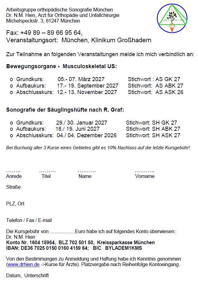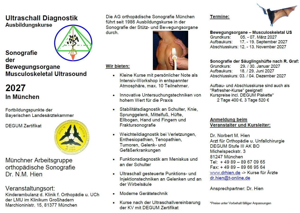 Bei Aufbau- und Abschlusskursen bitte die Bilder und Befunde von jeweils mind. 10 eigenständig durchgeführten Untersuchungen mitbringen! Gebühren incl. DEGUM Zertifikatplakette bitte oben unter "Termine" den jeweiligen Kurs anklicken. Übernachtung: Gäste- und Hotelservice München: Tel.: ++49 (0)89 - 233 96 500, e-mail: tourismus.gs@münchen.de. Wir bieten: